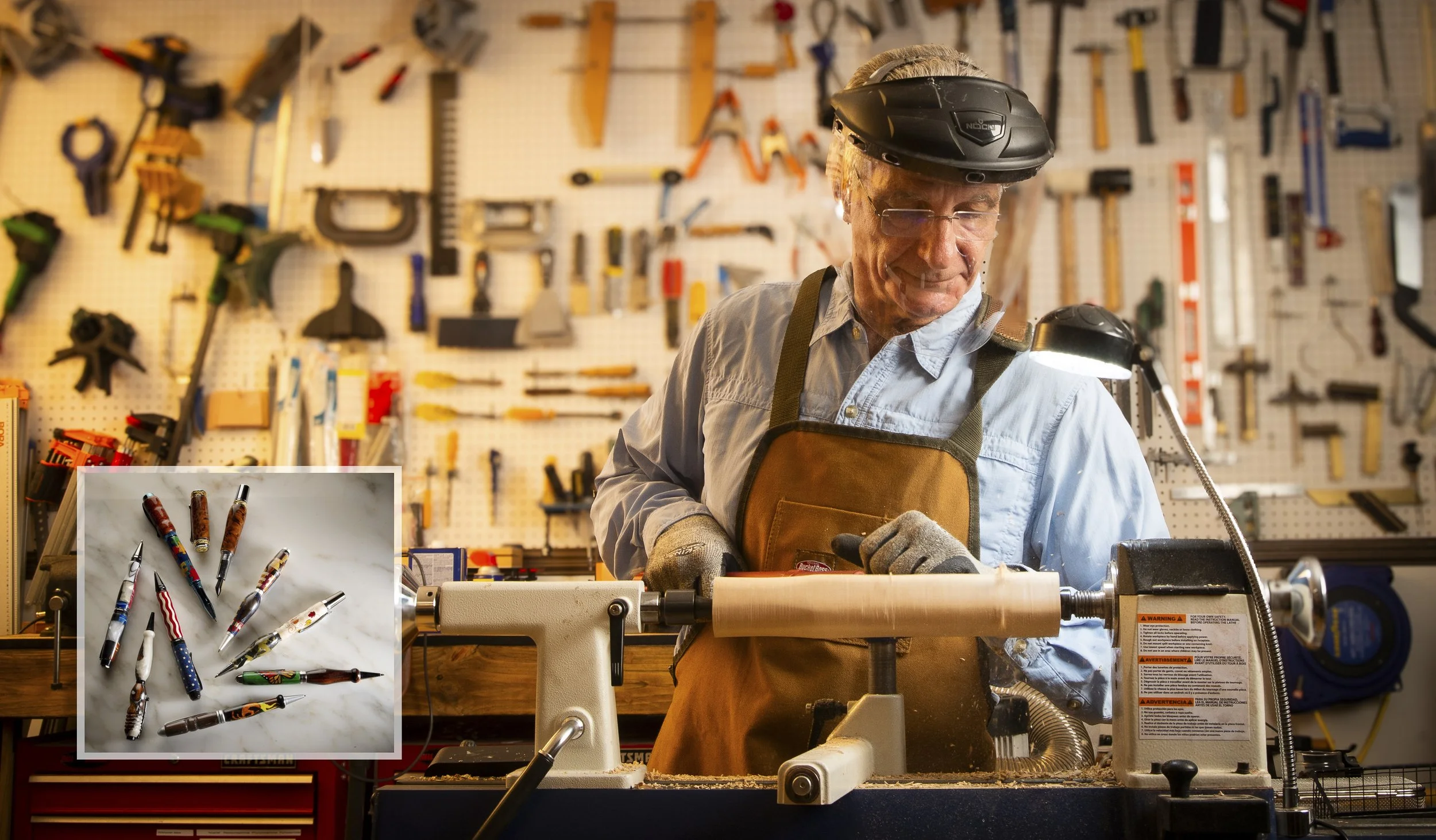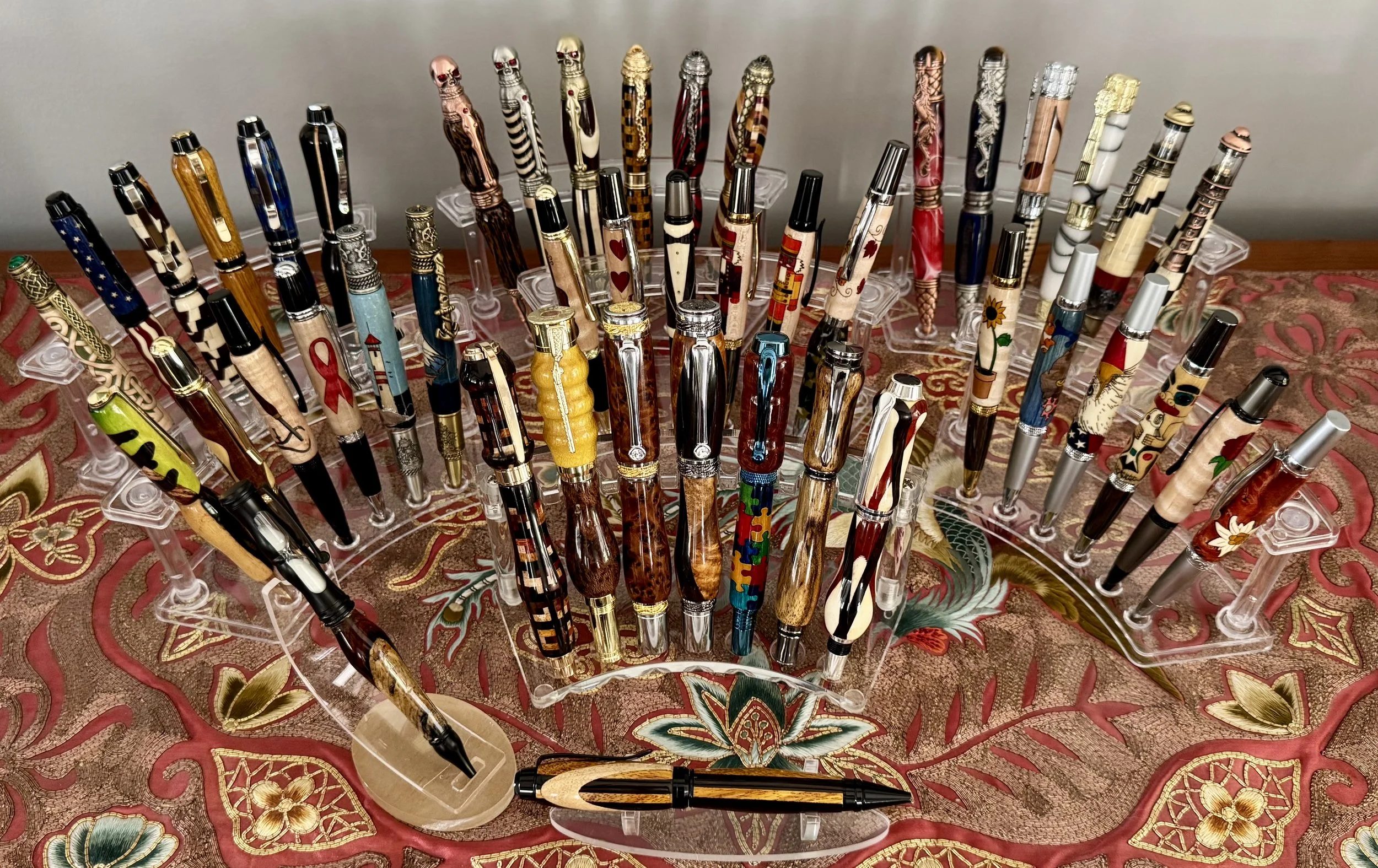 After retiring from a career in Plastic Surgery, I rekindled my interest in woodworking and took a class in woodturning pens. It hooked me! I love planning the patterns out in my head, making the blanks, and turning the pens. If you are interested in a personalized, hand made pen, I offer you the ability to choose your pen kit (the mechanism hardware), the material encasing the working parts (wood, acrylic, inlays, etc.), engraving of name or initials, colors, and finish (cyanoacrylate or friction polish). I have organized this site to display pens that I have made, examples of the pen kits available, woods and acrylics available, and an order form. If you prefer a kit or material that is not listed, let me know where you found it and I will try to obtain it. If we can meet in person after the order is placed but before the pen is started, I have developed a way to custom fit the portion of the pen that is gripped by your fingers for added comfort. I want my pens to be both works of art and comfortable writing instruments.
